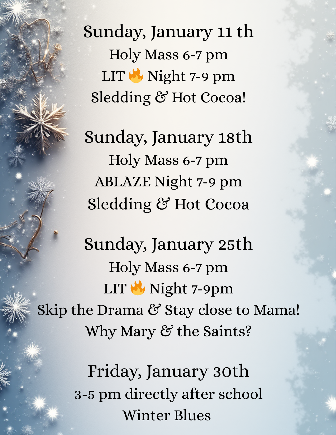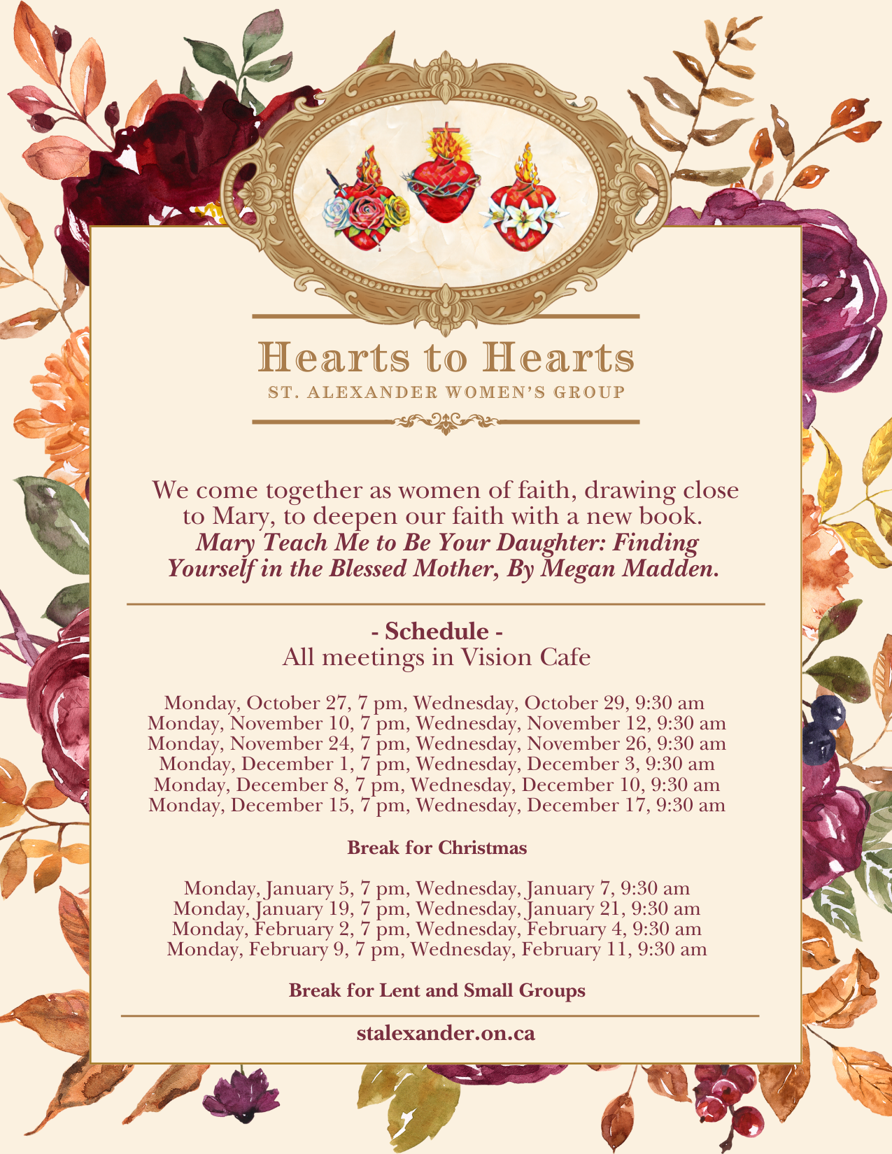 Thank you to all the ladies who joined us for our first six sessions. We will be concluding with our remaining four sessions on the book "Mary Teach Me to be Your Daughter: Finding Yourself in the Blessed Mother" starting on January 5th. Weekly sessions run either Monday nights or Wednesday mornings. Please feel free to join us!