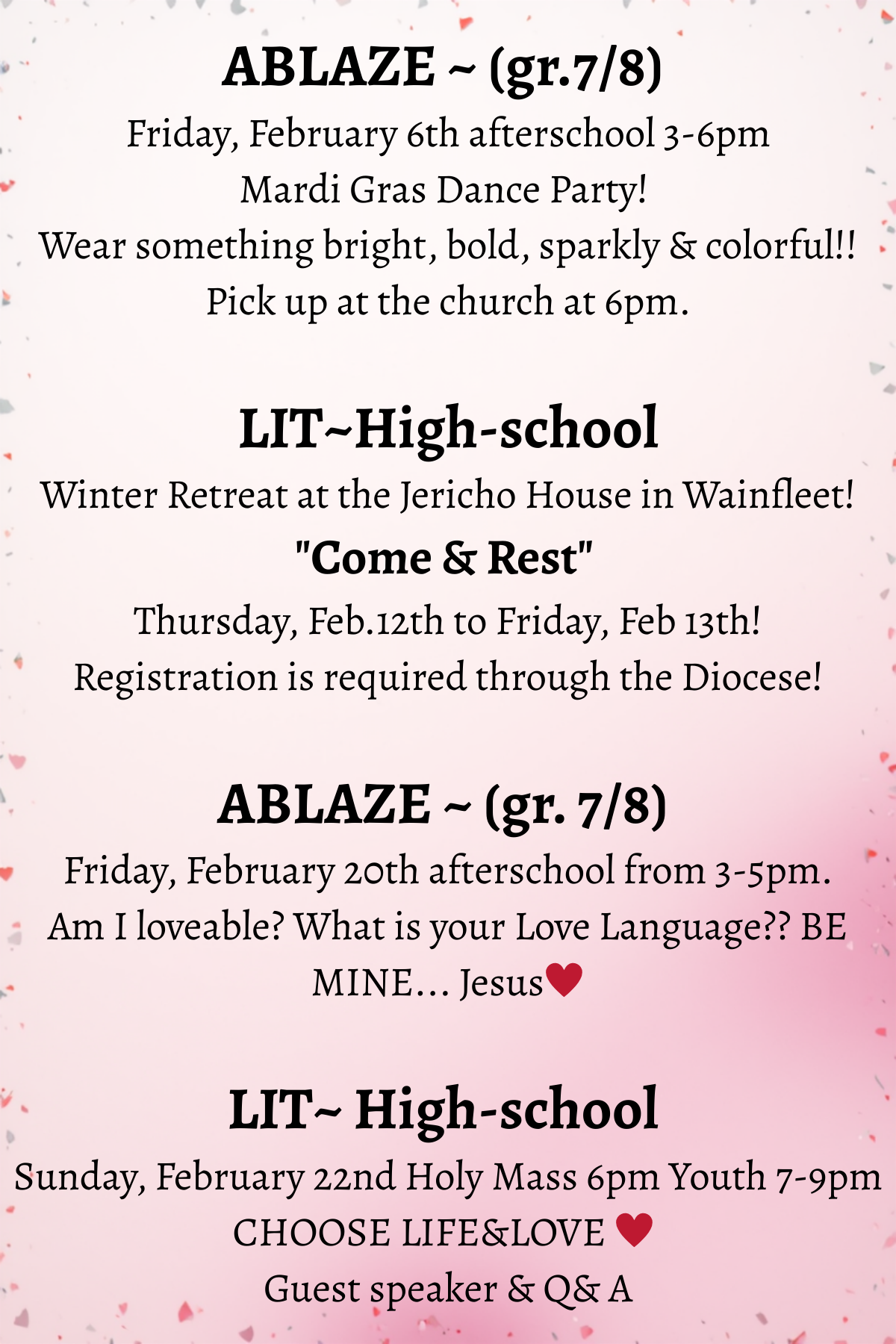Thursday to Friday (PA DAY) , Feb. 12-13th overnight retreat at the Jericho House. The overnight retreat will be a mix of FUN & community! Since it is near Valentine's Day, the theme will be on relationships, "the real thing"...true authentic love ♥️